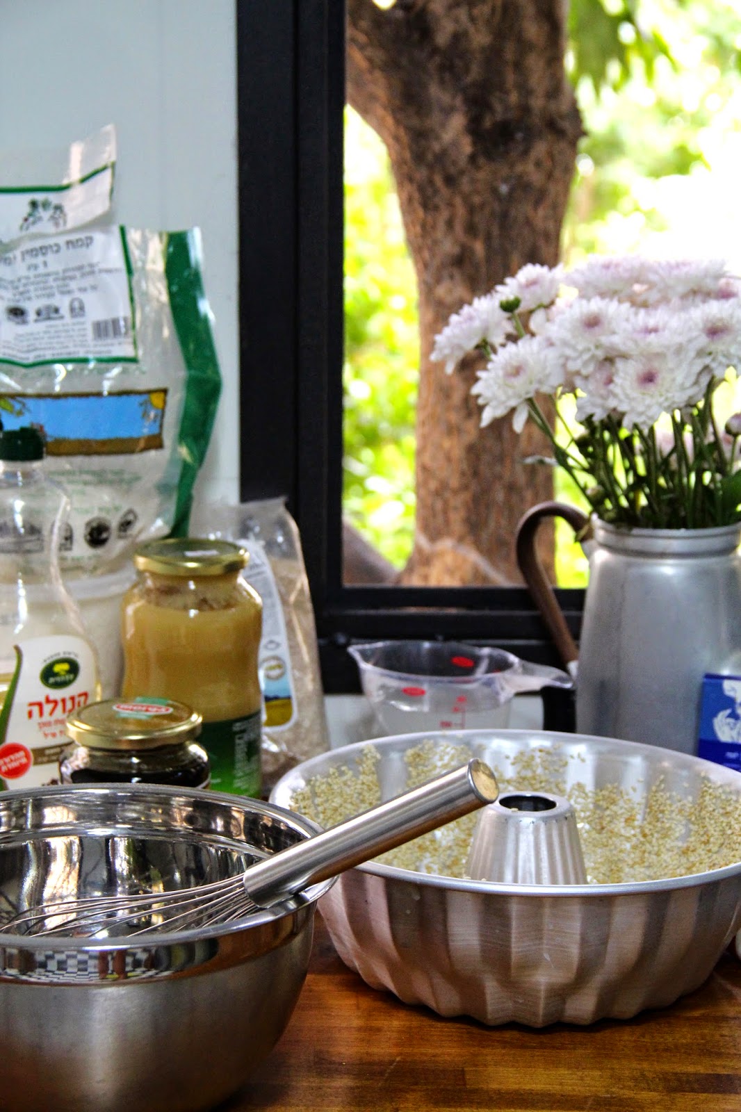 - משמנים את התבנית בשמן קוקוס במצב צבירה רך ומפזרים בנדיבות שומשום קלוי - זה יבטיח שהעוגה תחליק לכם